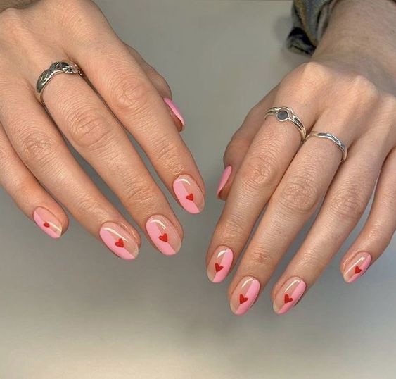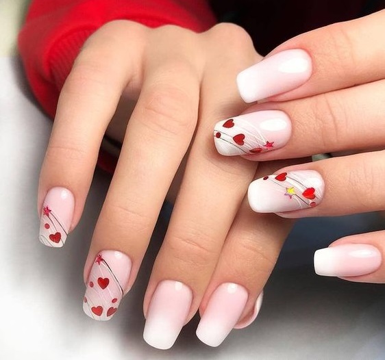 Также можно покрыть половину ногтя прозрачным лаком, а другую – нежно-розовым. А на их стыке нарисовать или наклеить маленькое сердце.