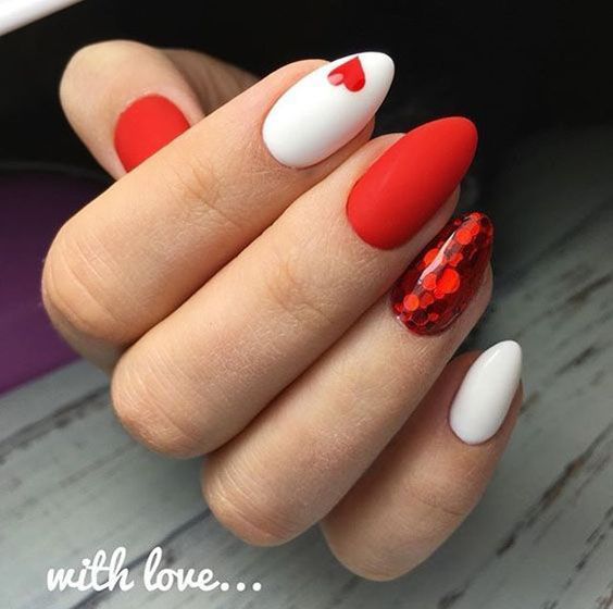 Еще один вариант – сочетать в маникюре белый и красный цвета. Также вы можете украсить один ноготь изображением сердца, а другой – блестками.