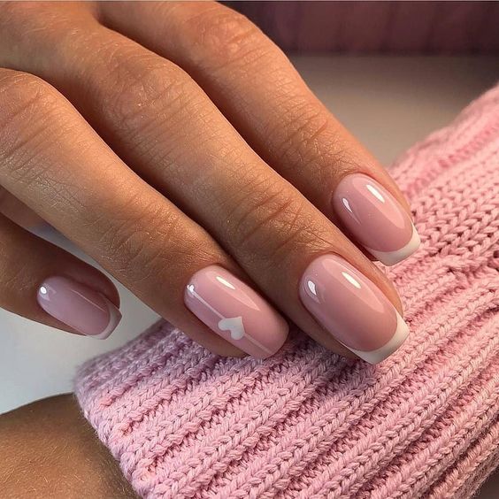 Еще один вариант – нежный френч розового оттенка с рисунком в виде сердца.