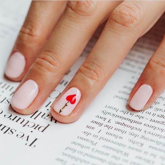 На коротких ногтях красиво будет смотреться белый или нюдовый маникюр. Если вы любите классику – выбирайте однотонное покрытие, а если не прочь поэкспериментировать – разнообразьте маникюр с символикой праздника – сердечками или поцелуйчиками.