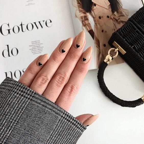 На День влюбленных не обязательно делать маникюр в красно-белой гамме. Можно покрыть ногти светло-коричневым цветом, а сердечки нарисовать черным.