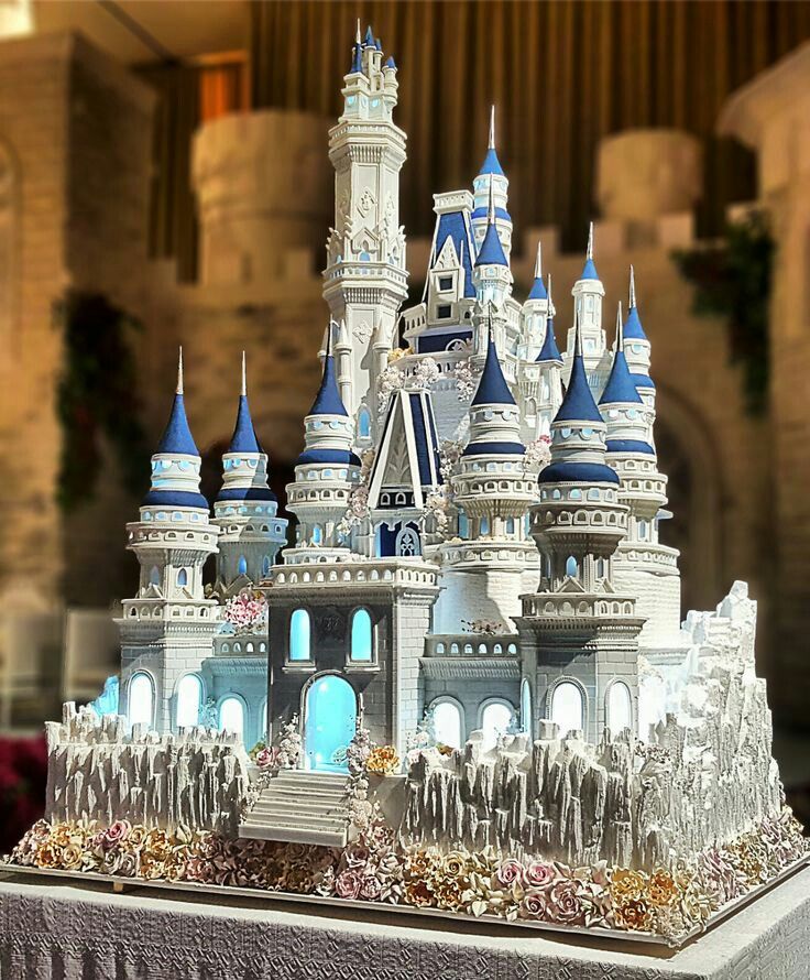 Если не знать, что это торт, то можно и не догадаться. Замок выполнен из различных видов мастики, шоколада и глазури. Также в нем установили маленькие фонарики, чтобы окна и арки светились изнутри.