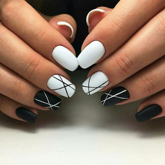 Еще один вариант – черно-белый маникюр. Несмотря на то, что большинство модниц выбирают летом яркие оттенки, есть и те, кто верен монохромной гамме. Покройте ногти черным и белым цветами, а дизайн сделайте с помощью геометрических линий.