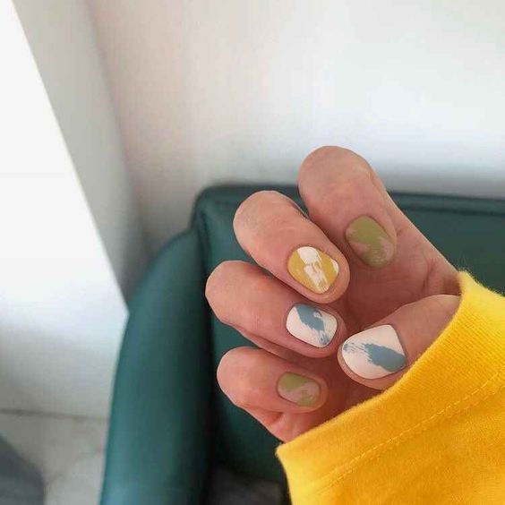 Если вы любите пастельные тона, советуем вам сделать нюдовый маникюр. Разнообразить его можно хаотично разбросанными мазками разного цвета, а сверху нанести матовое покрытие.