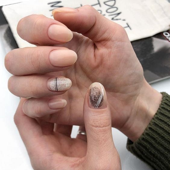 Еще один вариант дизайна – однотонный маникюр со стемпингом. Это перенесение на ноготь при помощи штампа рисунка с трафарета. Например, на одном из ногтей сделайте необычный рисунок в виде отпечатка пальца.