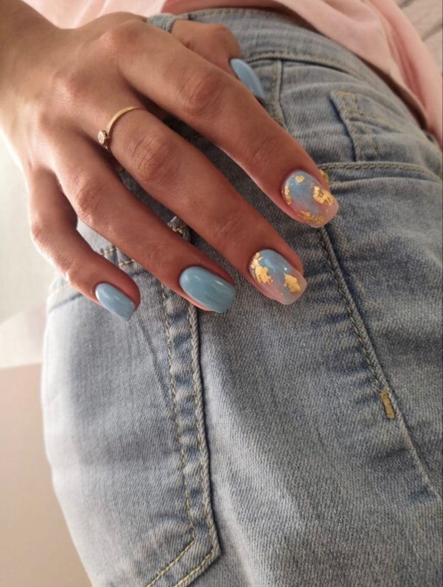 Еще один вариант летнего маникюра – дизайн с фольгой. Вы можете покрыть ногти одним или несколькими оттенками, а сверху сделать яркие акценты с золотистой фольгой.