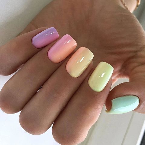А тем модницам, которые долго не могут определиться с выбором цвета, предлагаем интересный вариант. Возьмите 3-4 пастельных оттенка и совместите их в одном маникюре, при чем на каждом ногте можно сделать оригинальный узор.
