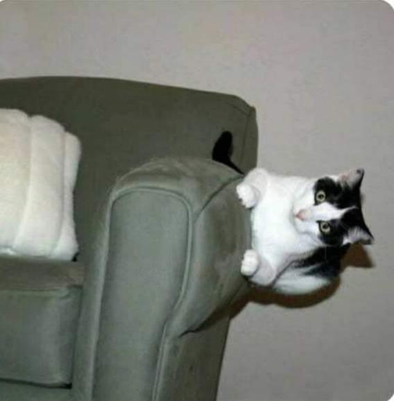 А вот еще один пример того, что на кошек гравитация не действует. Этот парень просто решил прилечь на боковой части кресла, почему нет?