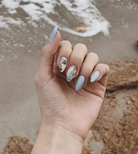 Смелым модницам советуем покрыть ногти голубым оттенком, а на одном или двух сделать разнообразные арты. Например, дизайн под названием "перепелиное яйцо" или рисунок в виде силуэта лица.