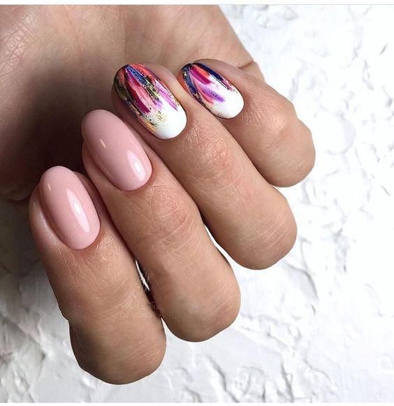 Также вы можете покрыть основную часть ногтей бежевым цветом, а 1-2 – белым, на которых можно сделать различные рисунки или просто мазки.