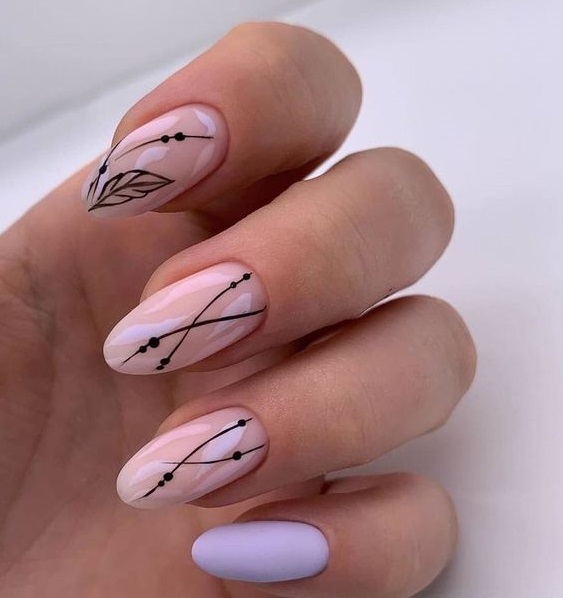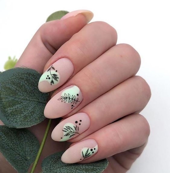 Еще один вариант – маникюр с матовым покрытием и лиственными узорами. Особенно красиво такой дизайн будет смотреться на длинных ногтях миндалевидной формы.