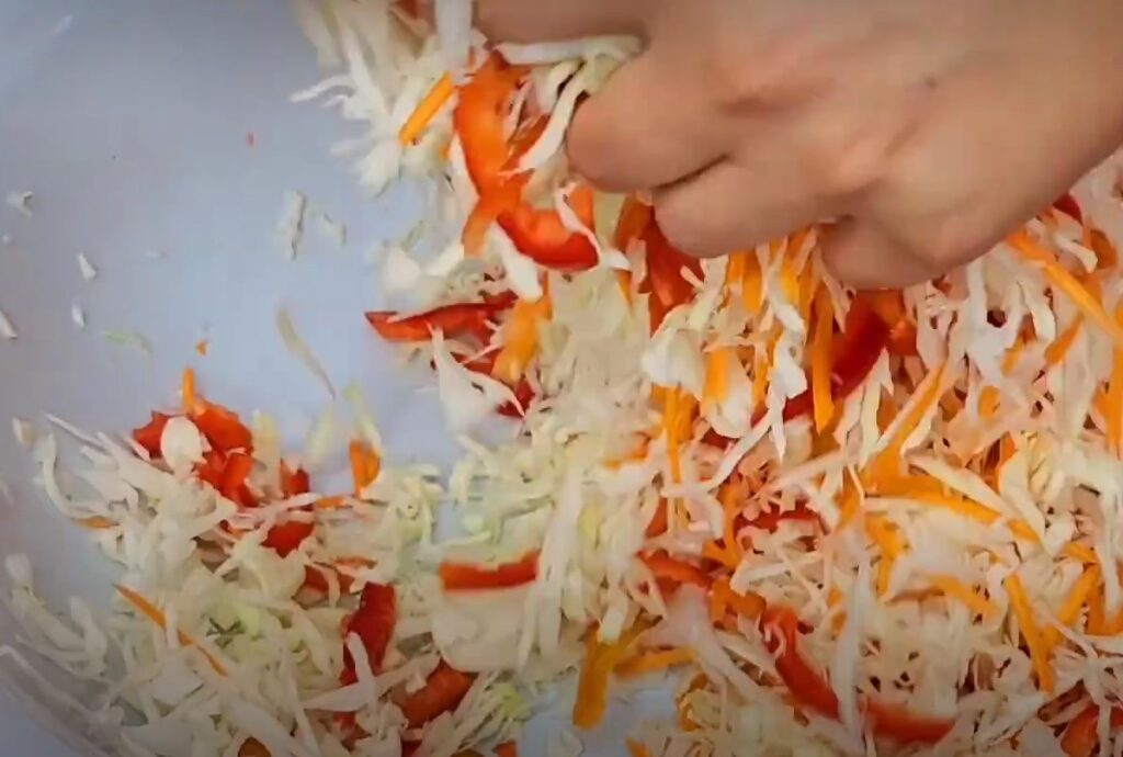 Из капусты, моркови и чеснока готовим салат, все ингредиенты складываем в большую миску и хорошо перемешиваем.