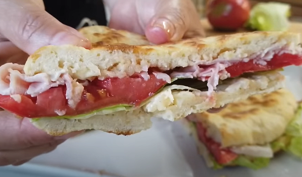 theLime рассказывает рецепт приготовления фокаччи на сковороде с начинкой из ветчины и овощей.