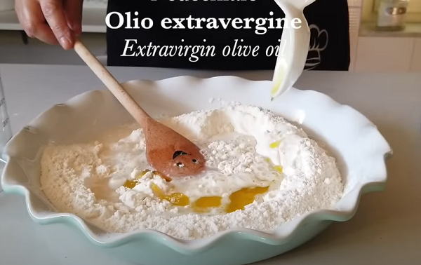 Просейте муку в миску, влейте воду, 20 мл оливкового масла и добавьте быстродействующие дрожжи и соль, образовавшуюся массу перемешайте.