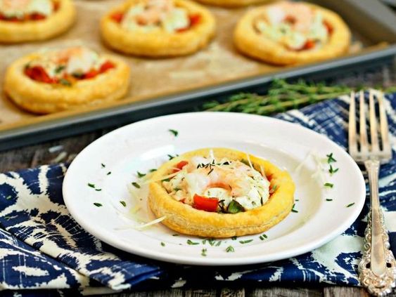 Ингредиенты: тарталетки (15 шт.) или слоеное тесто (200 г), креветки (15 шт.), помидоры черри (15 шт.), сливочный сыр (100 г), укроп, петрушка, базилик.
