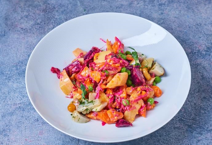 Ингредиенты для салата: картофель (400 г), морковь (200 г), свекла (200 г), мякоть тыквы (160 г), соленые или маринованные грибы (100 г), красный лук (50 г), замороженный зеленый горошек (100 г), зерновая горчица (10 г), квашеная капуста (100 г), сахар, соль.