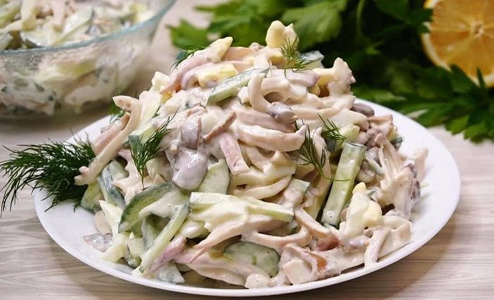 Ингредиенты: кальмары (200 г), огурцы (150 г), яйца (2 шт.), красный лук (1 шт.), зелень (пучок),горчица (0,5 ч. л.), густой йогурт (50 мл).