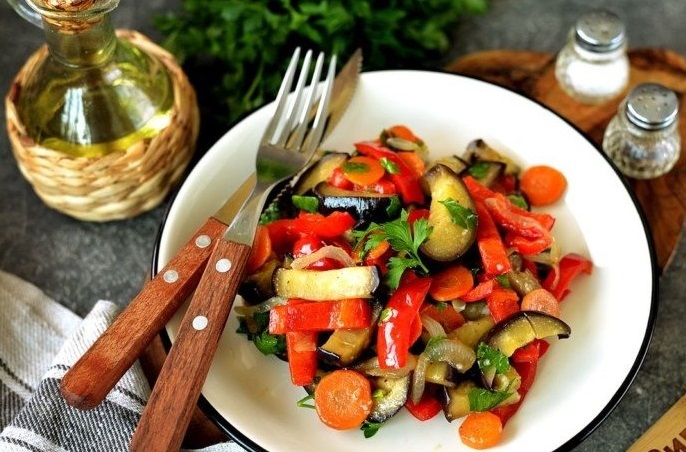 Ингредиенты: баклажан (2-3 шт.), сладкий перец (2-3 шт.), помидор (3-4 шт.), лук-шалот или красный лук (1 шт.), кинза, петрушка, укроп, соль, перец, оливковое масло (1-2 ст. л.).