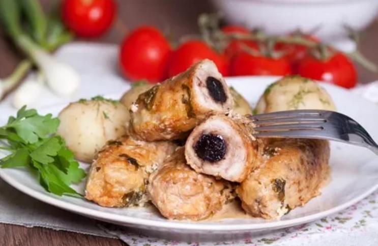 Ингредиенты для кручеников с черносливом на Крещение-2022: свиная вырезка (400 г), чернослив (80 г), сметана (2 ст.л.), майонез (1 ст.л.), вода (50 мл), соль, перец и мускатный орех по вкусу.