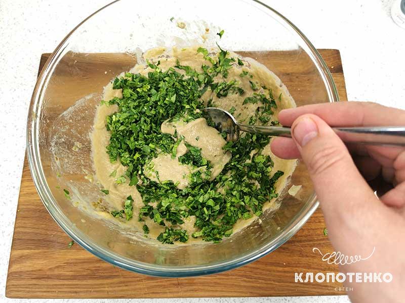Хорошо перебейте массу блендером до однородности. Измельчите зелень петрушки, укропа или кинзы и добавьте к бабаганушу.