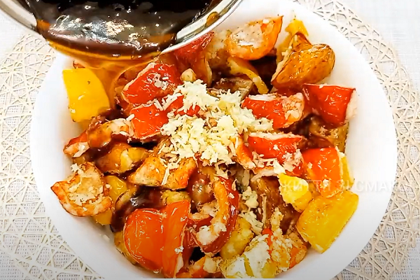 Обжаренные баклажаны и перец складываем в тарелку и присыпаем натертым чесноком. Сверху поливаем обжаренные овощи соусом, осторожно перемешиваем и складываем на тарелку. Перед подачей на стол можно посыпать белым кунжутом.