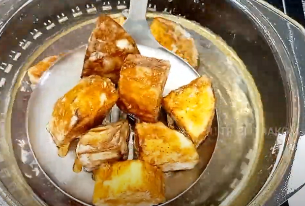 Нагреваем 400 мл подсолнечного масла и обжариваем в нем кусочки баклажанов и перцев до хрустящей золотистой корочки.