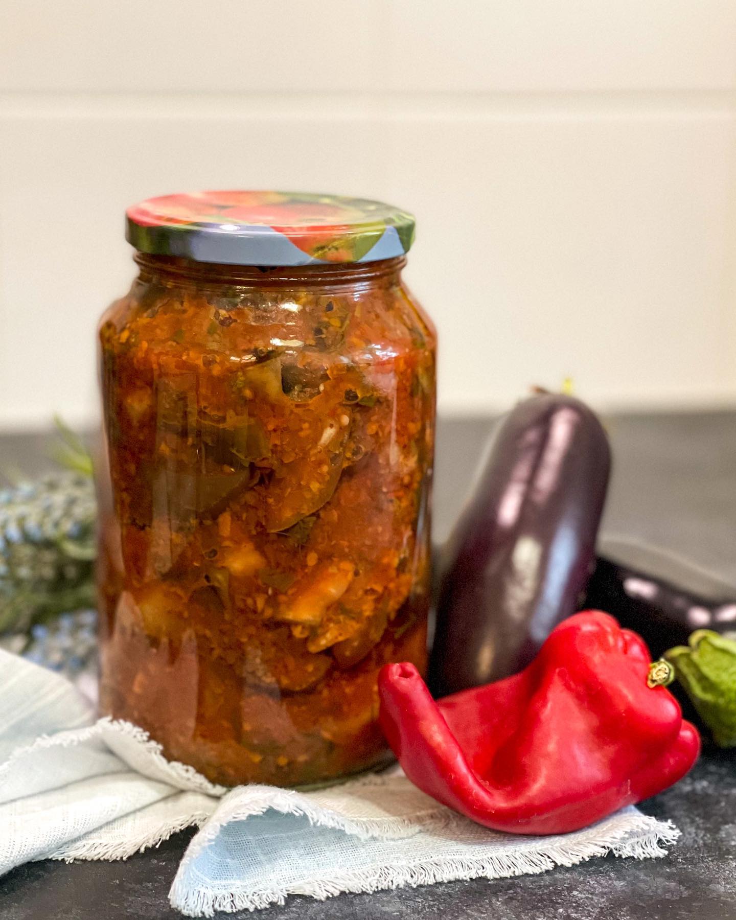 Ингредиенты на 7 банок по 0,5 л: баклажан (1,5 кг), болгарский перец (500 г), чеснок (4-5 зубчиков), горький перец (1 стручок), растительное масло (200 мл), уксус 9% (50 мл), соль (1 ст. л.), сахар (3 ст. л.).
