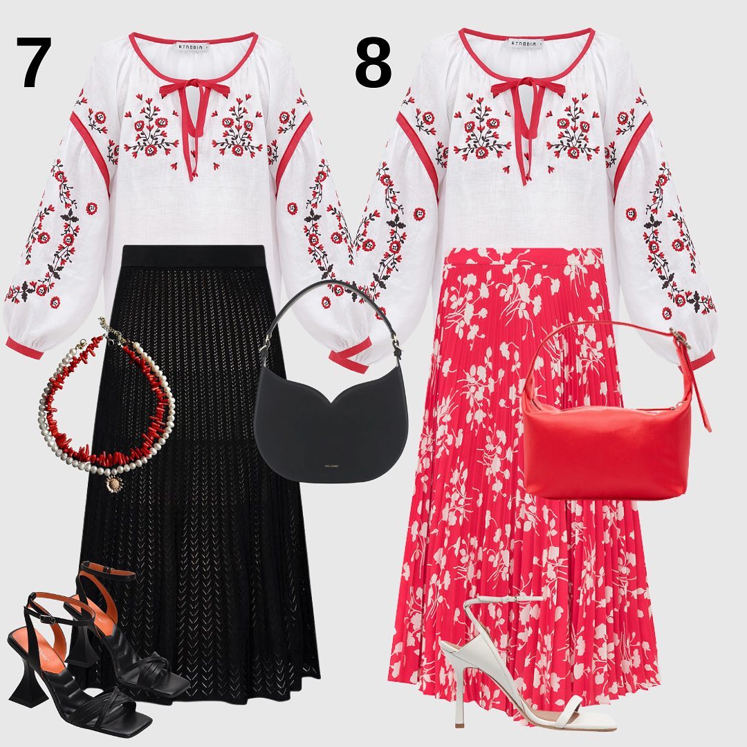 Юбки плиссе, которые были главным трендом в прошлые сезоны, продолжают лидировать и в 2023 году. Поэтому смело включайте эту модель в повседневные и праздничные образы с вышиванкой.