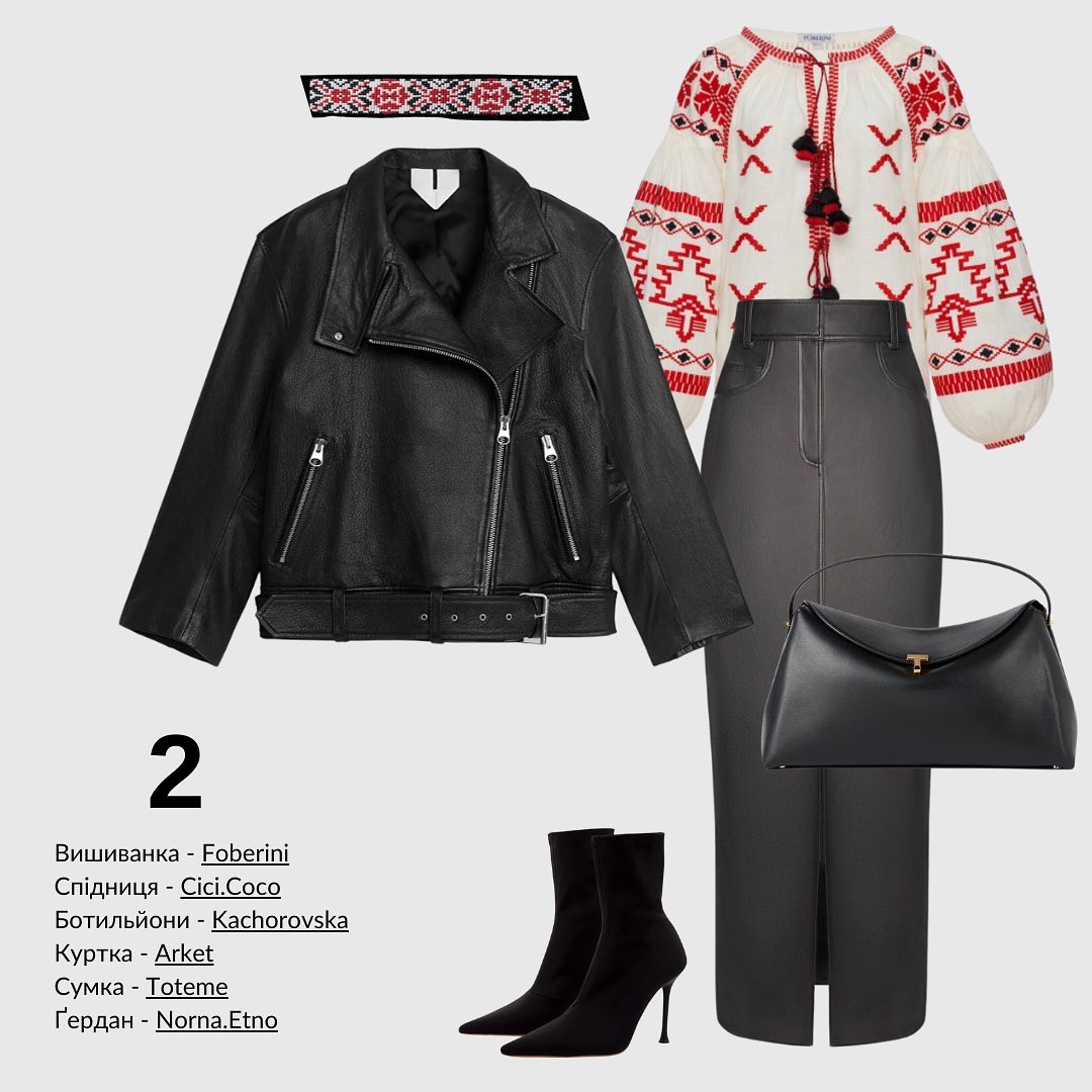 Еще один вариант современного образа с вышиванкой - с макси-юбкой из эко-кожи, курткой-косухой и остроносыми ботильонами на шпильке.