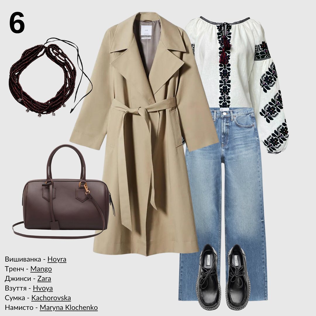 Стилист предлагает сочетать вышиванку с брюками палаццо и тренчем в тон сорочки. Дополнить пастельный образ можно балетками с тонким ремешком на подъеме и металлической пряжкой из белой лаковой кожи и серой сумкой с уникальной изогнутой формой.