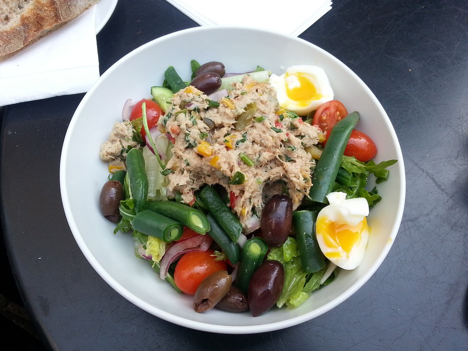 Для приготовления вам понадобятся такие ингредиенты: тунец консервированный (1 банка), листья салата (150 г), стручковая фасоль (100 г), помидоры черри (8 шт.), яйца (4 шт.), маслины или оливки (10 шт.), чеснок (1 зубчик), оливковое масло (4 ст. л.), винный уксус (2 ч.л.), горчица (1 ч. л.), соль, перец (по вкусу).