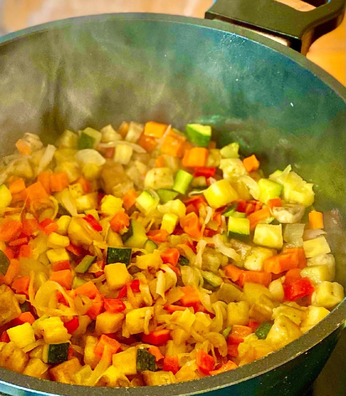 Разогреваем сковороду с толстым дном и растительным маслом, обжариваем поочередно лук, морковь, перец, кабачки и баклажаны. Обжариваем каждый ингредиент где-то по 1 минуте, а затем уже всю смесь тушим 10 минут под крышкой, периодически помешивая.