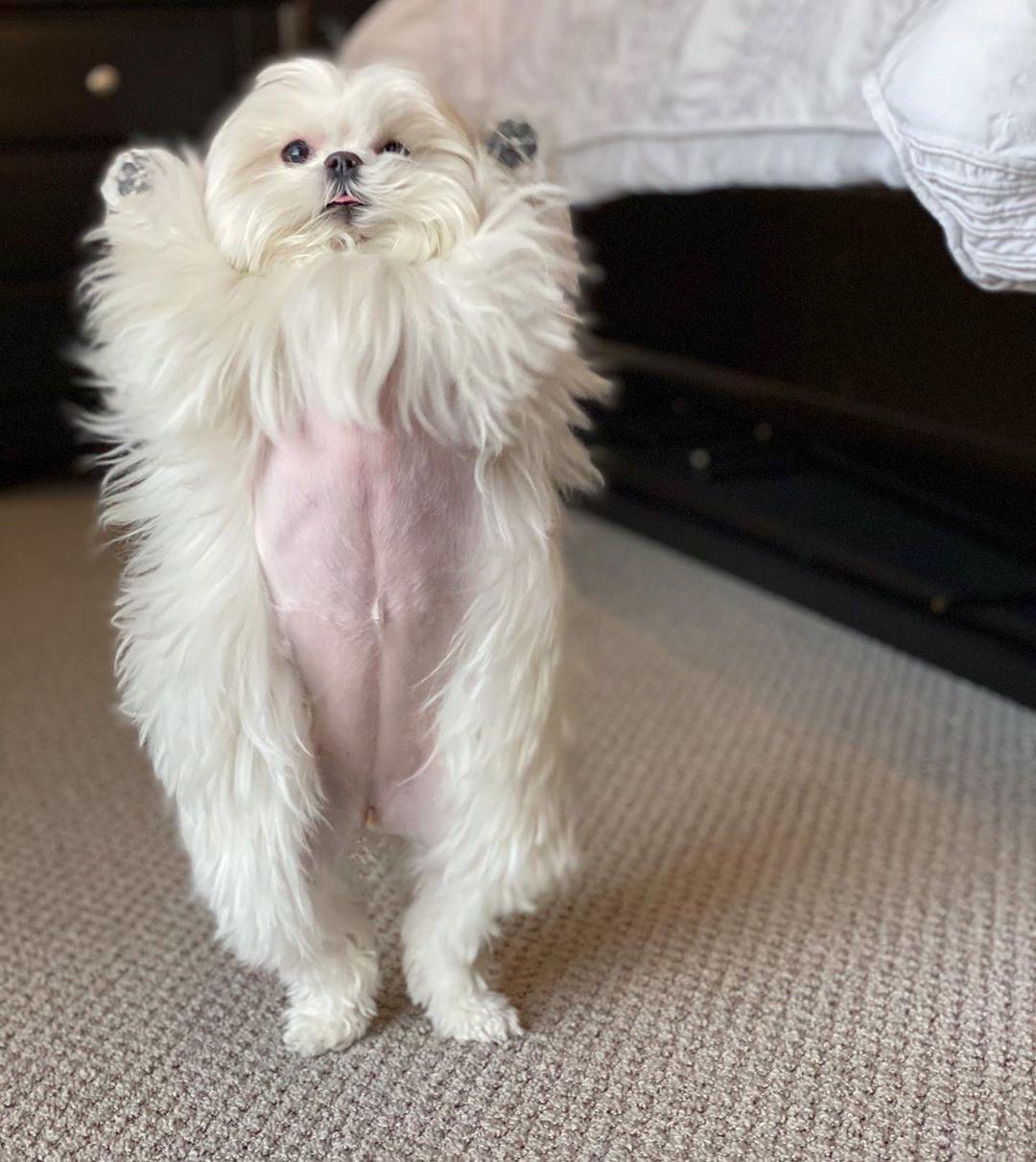 Ко всему прочему Коко обладает талантом ходить и позировать на двух задних лапках, что под силу далеко не всем рядовым питомцам. Однажды хозяева похвастались умением Коко, и с того времени уже не смогли остановиться.