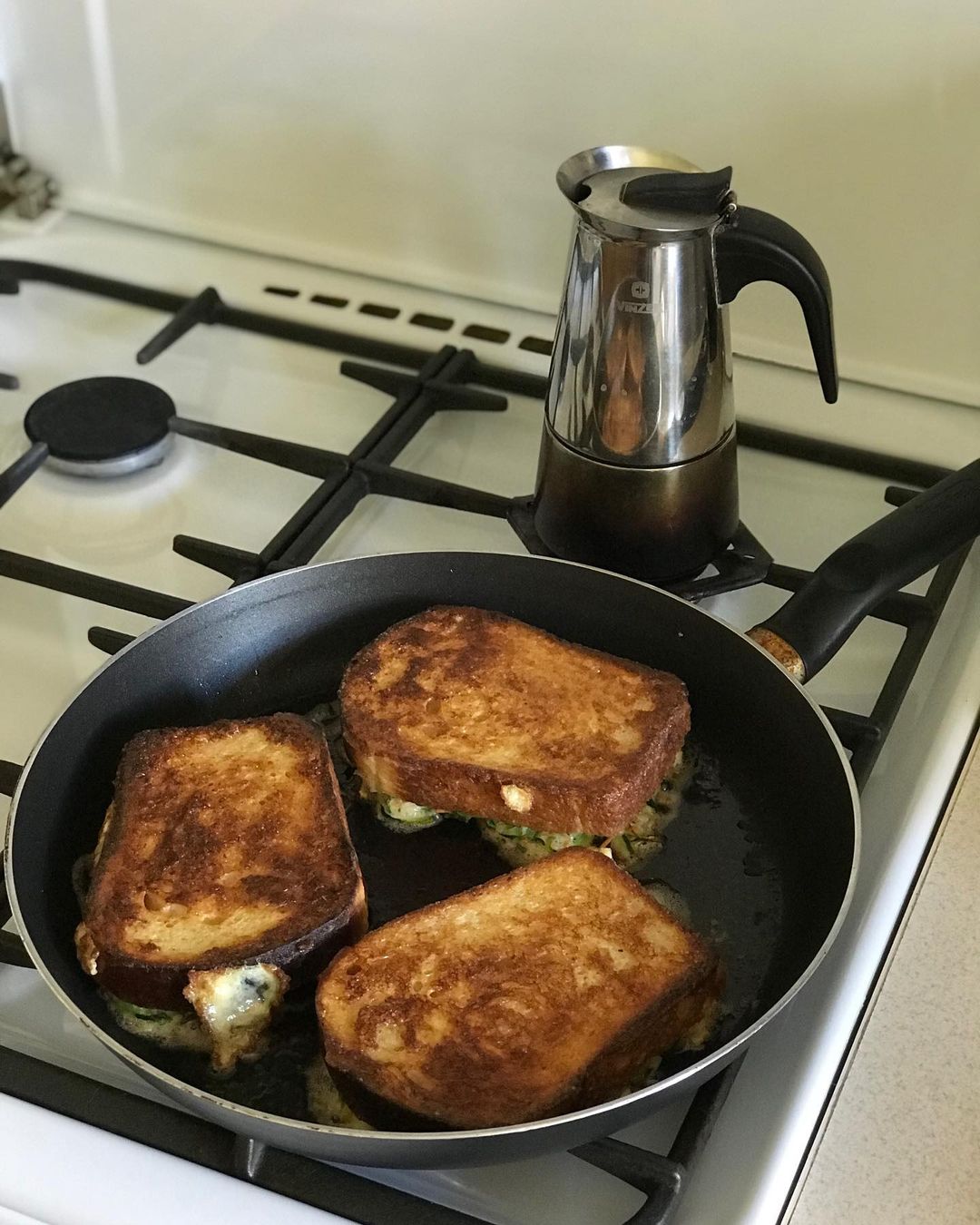 Жарим на среднем огне низ горячего бутерброда до золотистой корочки, затем убавляем огонь до минимума и аккуратно переворачиваем начинкой вниз, сверху немного придавливаем лопаткой. Жарим до готовности – примерно 4-5 минут.