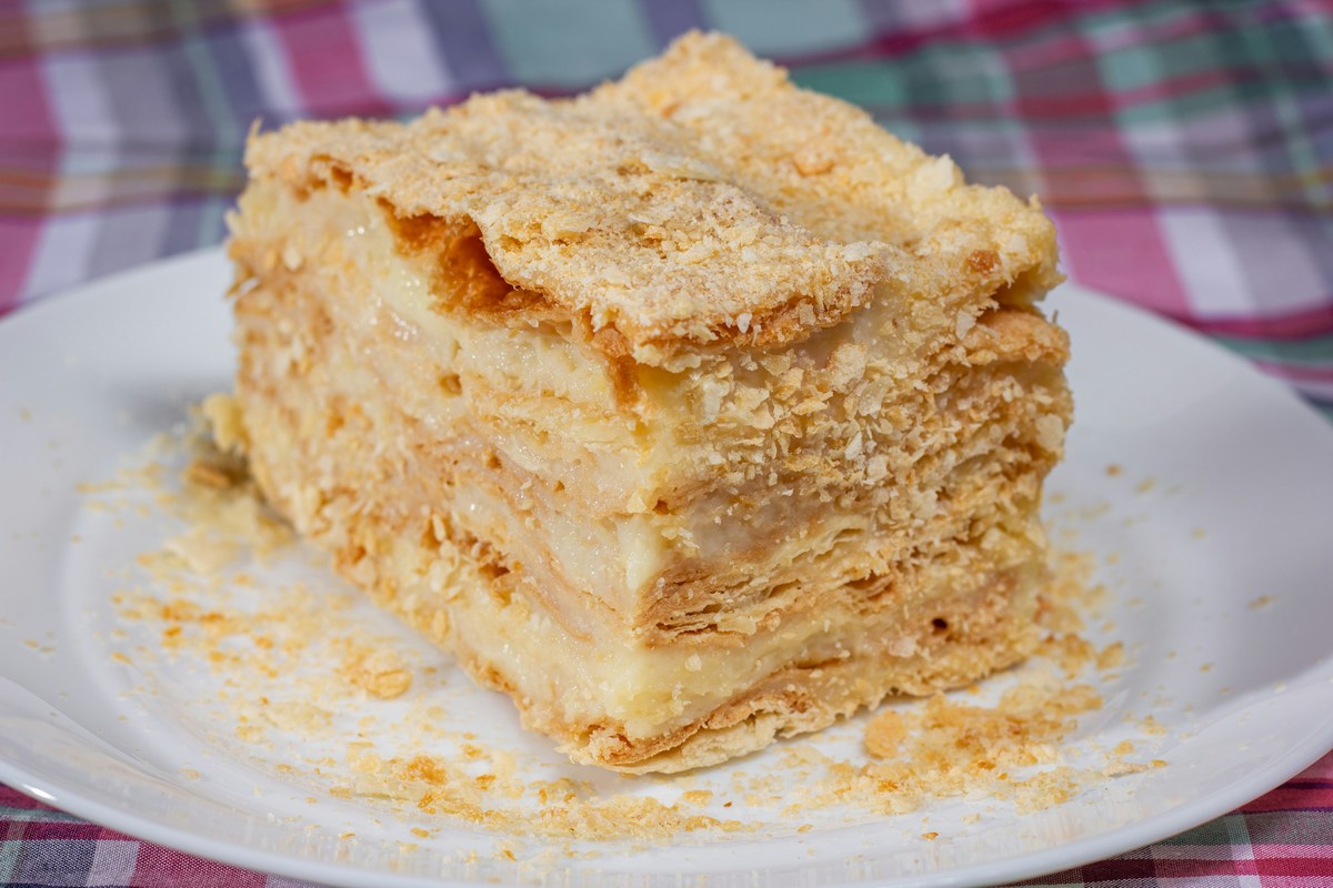 В традиционном варианте торт Наполеон готовят из тонких слоеных коржей, которые выпекают и пропитывают нежным заварным кремом. В этой вариации духовка вам не понадобится.
