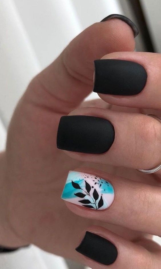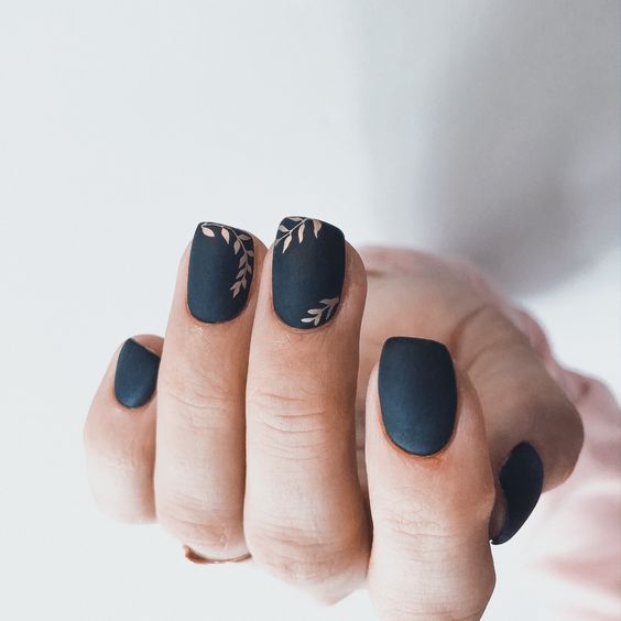 Для праздничного мероприятия подойдет креативный черный маникюр с матовым топом и лиственные узоры золотистого или серебристого оттенка.