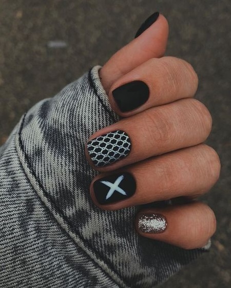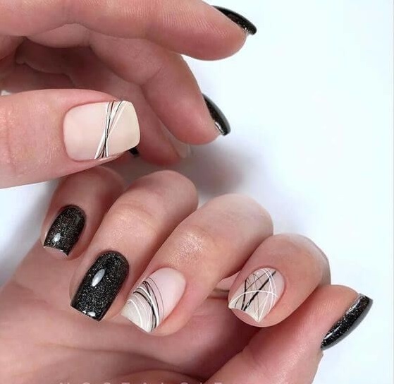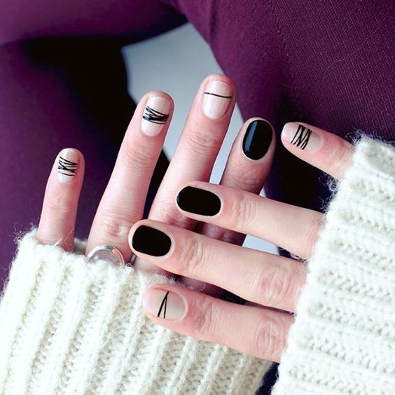 Обладательницам коротких ногтей можно также поэкспериментировать с черным и нюдом, покрыв несколько ногтей одним цветом, а остальные – другим. Разнообразить их можно дизайном с хаотичными мазками контрастного цвета.