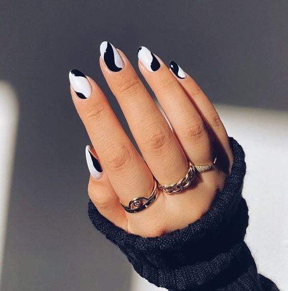 Также в трендах – волнистый маникюр. Такой дизайн можно сделать в бело-черных тонах. Особенно красиво он будет смотреться на длинных ногтях миндалевидной формы.