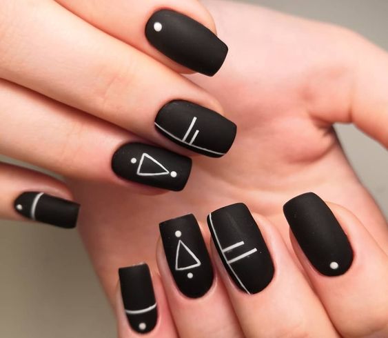 На черном матовом покрытии красиво будут выглядеть белые геометрические фигуры. Вы можете поэкспериментировать и украсить каждый ноготь разной фигурой или же сделать дизайн на одном ногте каждой руки.