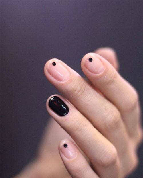 Для более смелых модниц советуем выбрать маникюр, в котором черное покрытие сочетается с полупрозрачным. Несколько ногтей покройте черным, а остальные – лаком естественного оттенка. На этих ногтях сделайте черные точки.