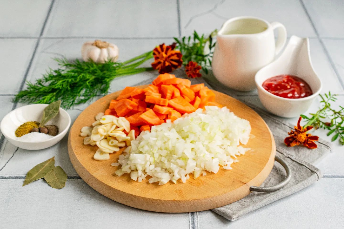 Приготовление: репчатый лук нарезаем мелкими кубиками, морковь – кольцами. На сковородку с разогретым маслом выкладываем измельченный лук. Помешивая, пассеруем овощи на среднем огне до мягкости. Добавляем к луку измельченную морковь. Перемешиваем, продолжаем готовить овощи вместе еще 3 минуты.