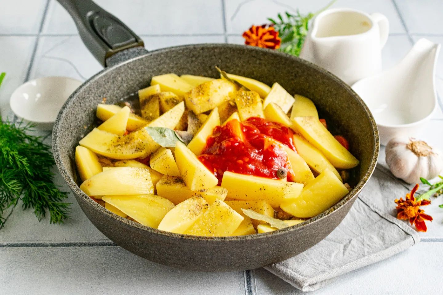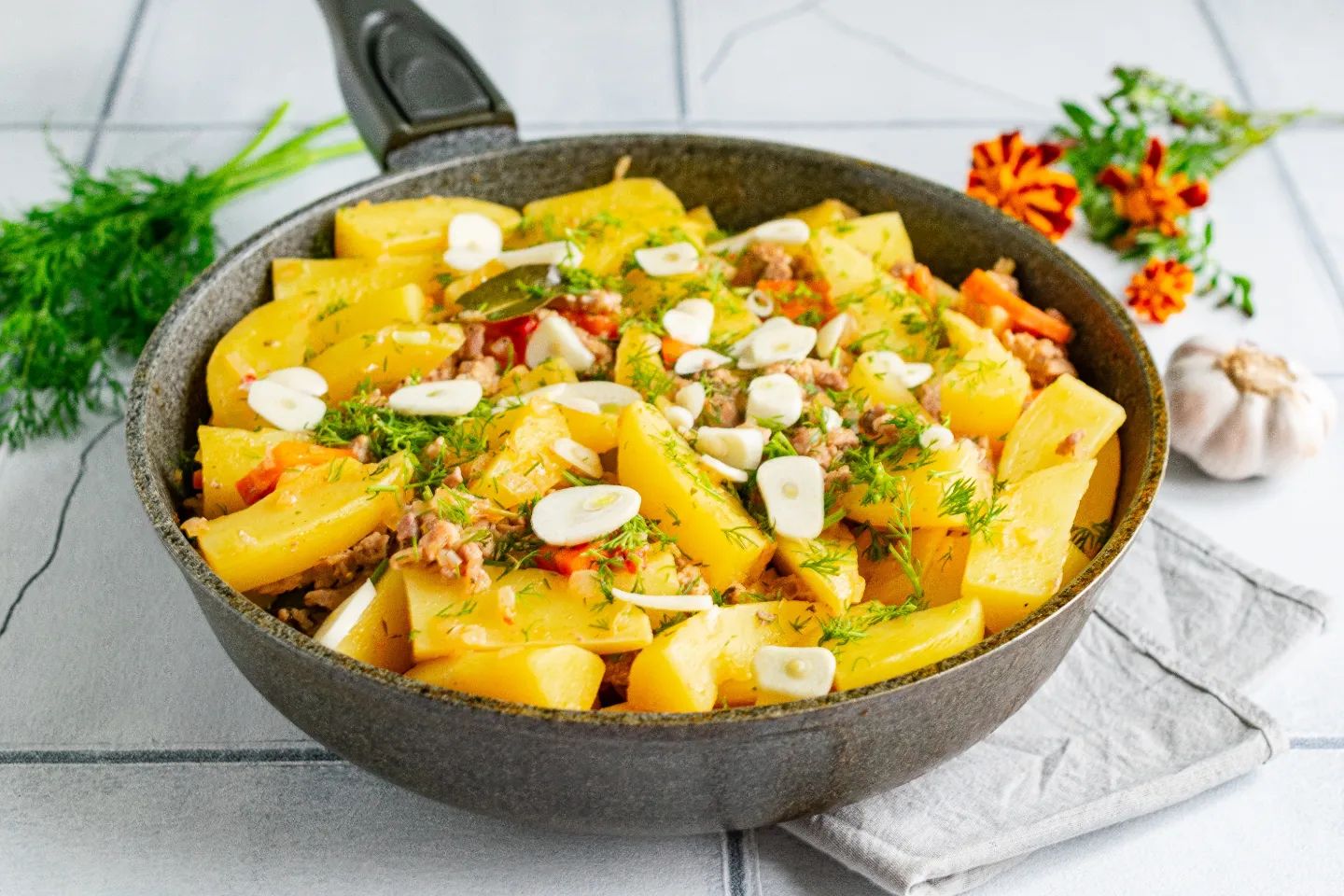 Ингредиенты: вода или бульон – 200 мл; картофель – 350 г; мясной фарш – 200 г; репчатый лук – 1 шт; морковь – 1 шт; томатный соус – 2 ст л; чеснок – 1-2 зубчика; растительное масло – 45 мл; соль – 0,5 ч л; черный молотый перец – 0,25 ч; хмели-сунели – 0,5 ч л; лавровый лист – 1-2 шт; черный душистый перец – 3 горошины; свежий укроп – 1 пучок.