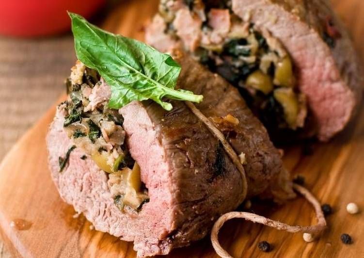Делаем в мясе глубокий надрез до половины толщины куска. Затем делаем надрезы справа и слева, также не разрезая кусок, а оставляя стенки толщиной около 7 мм. Отбиваем мясо, натираем чесноком, пропущенным через пресс, а также солью и специями.