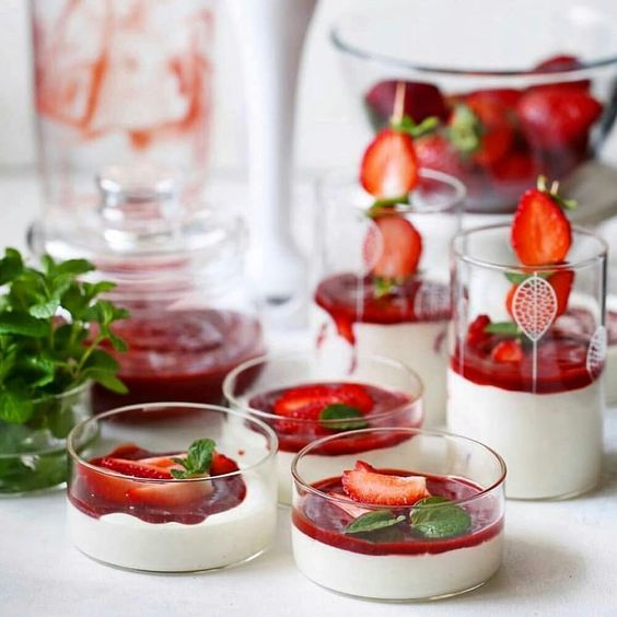 Берем формочки, например, силиконовые, и выливаем в них клубничную массу, ставим в холодильник на 20-30 минут. Если нет формочек, делаем в стаканах или креманках, в которых потом будем подавать.