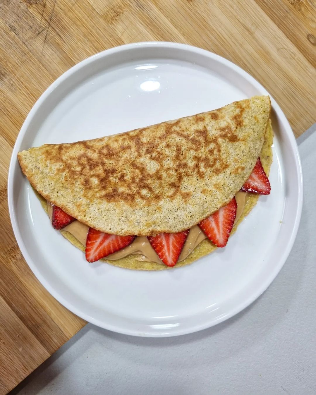 Разбиваем в глубокую емкость яйцо и добавляем овсянку, водуи соль. Выливаем смесь на хорошо разогретую сковороду. Жарим несколько минут под крышкой. Готовый овсяноблин смазываем ореховой пастой. Внутрь кладем апельсин или любые другие фрукты, складываем его пополам.