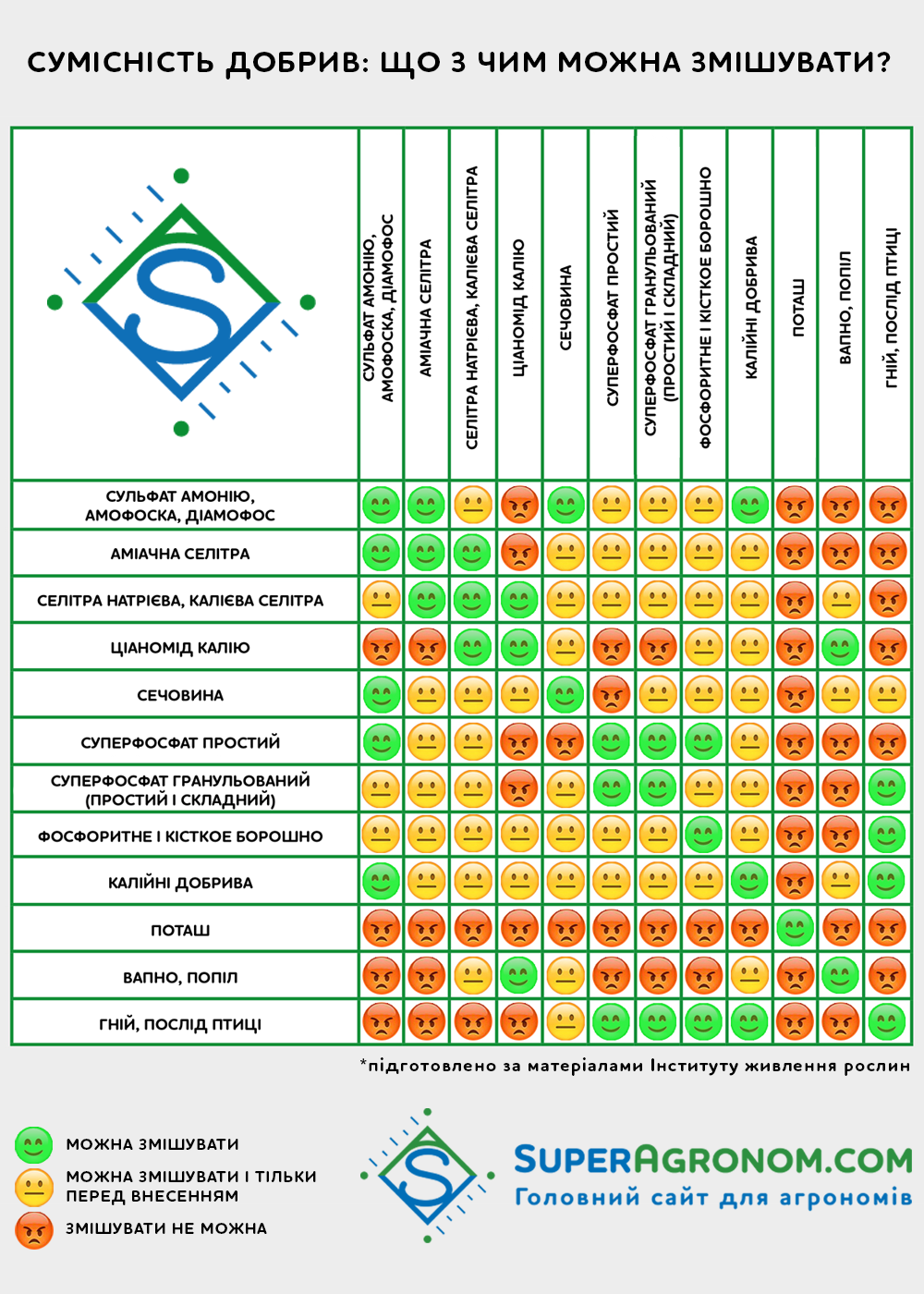 Если смешать карбамид или аммиачную селитру и недостаточно сухой суперфосфат, то физические свойства удобрений станут хуже. Смесь получится влажной и будет плохо рассеиваться.
