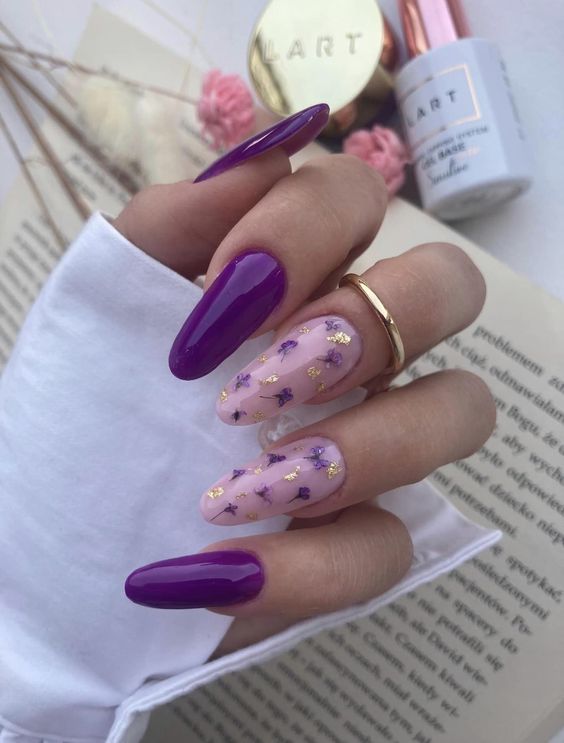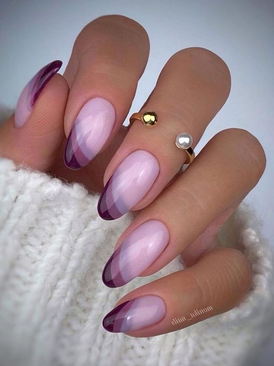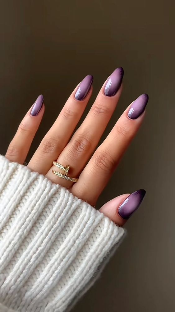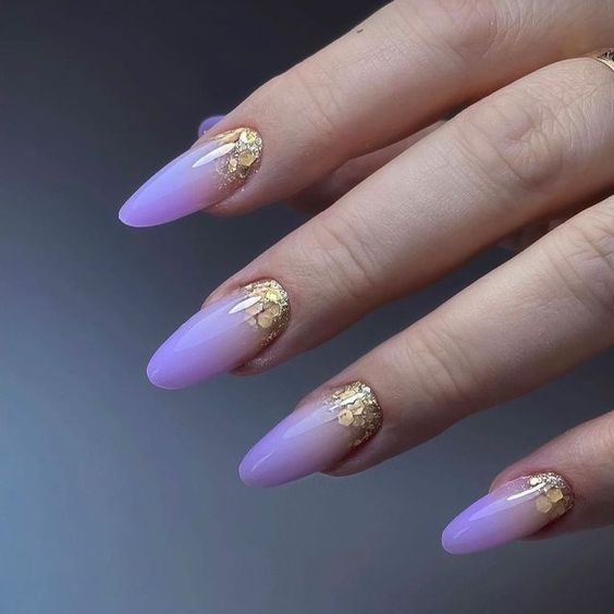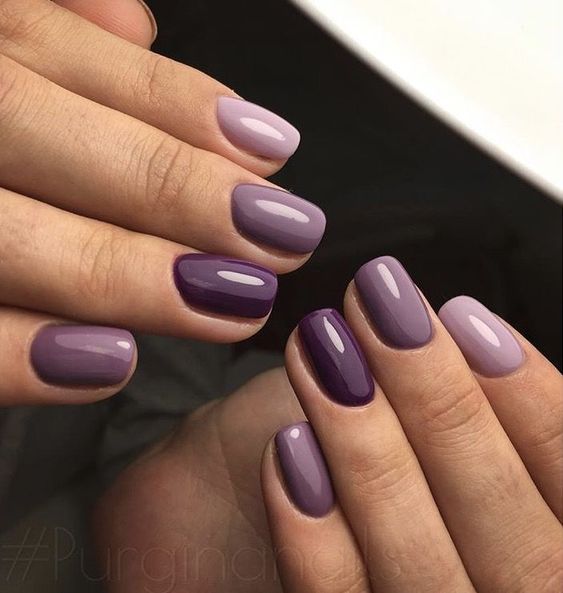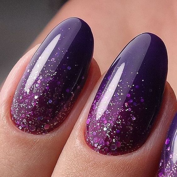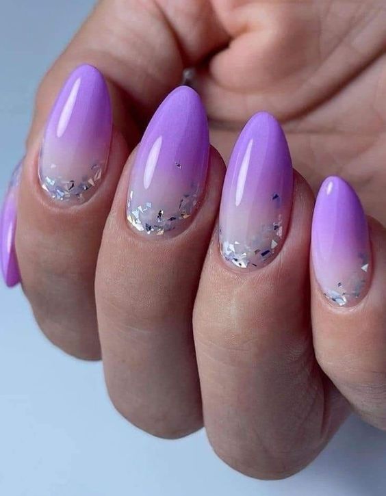 С фиолетовыми оттенками можно сделать также маникюр омбре или, как его еще называют, градиентный – то есть с плавным переходом от одного цвета к другому, границы между которыми "размывают". Дополнят такой нейл-арт блестки или кусочки фольги.