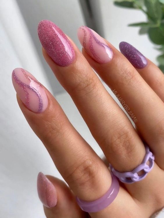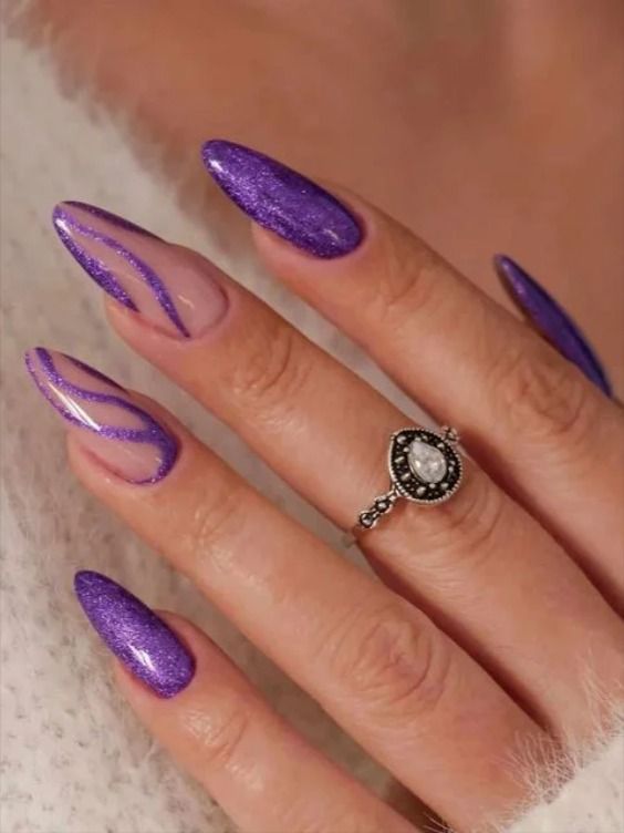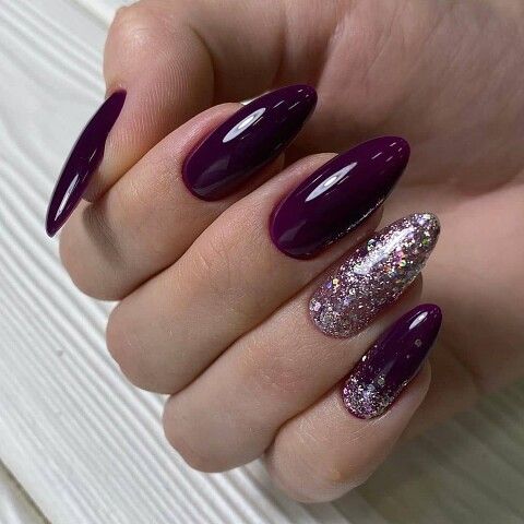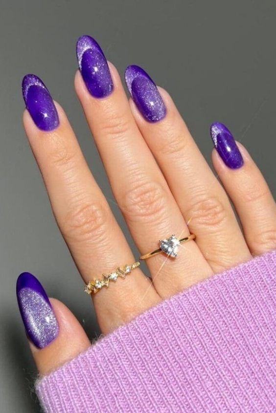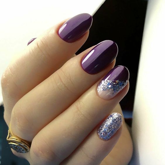 В преддверии новогодних праздников фиолетовый маникюр можно разнообразить блестками. Такой вариант подойдет для ногтей разной длины и формы.