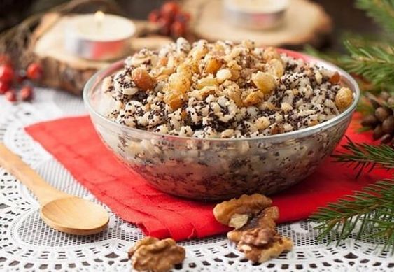 Ингредиенты: пшеница (1 стакан), мак (100 г), грецкие орехи (1 стакан), изюм (100 г), вода, жидкий мед.