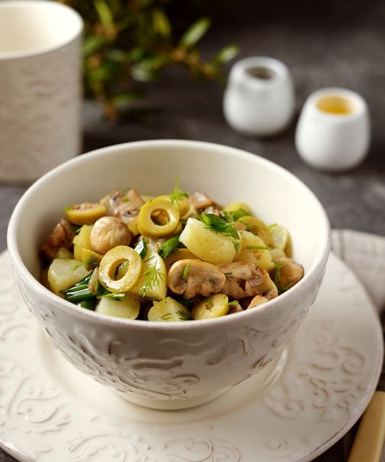 Ингредиенты для салата : картофель (3-4 шт.), грибы (600 г), маринованные огурцы (4 шт.), зеленый лук (1 пучок), чеснок (1 зубчик), оливковое масло, соль, свежемолотый черный перец.
